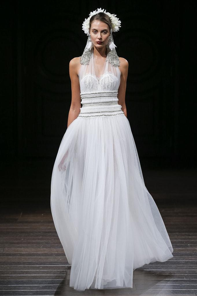 Tra le proposte di tendenza troviamo veli che coprono la parte alta della testa e scendono poi morbidi lungo le spalle, mantenendo sempre un aspetto leggero e quasi impalpabile, perfetti per arricchire un’acconciatura sposa per capelli sciolti semplice e naturale.